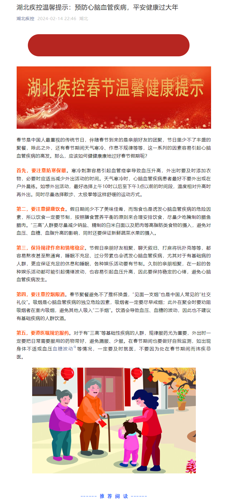 湖北疾控溫馨提示:預防心腦血管疾病,平安健康過大年