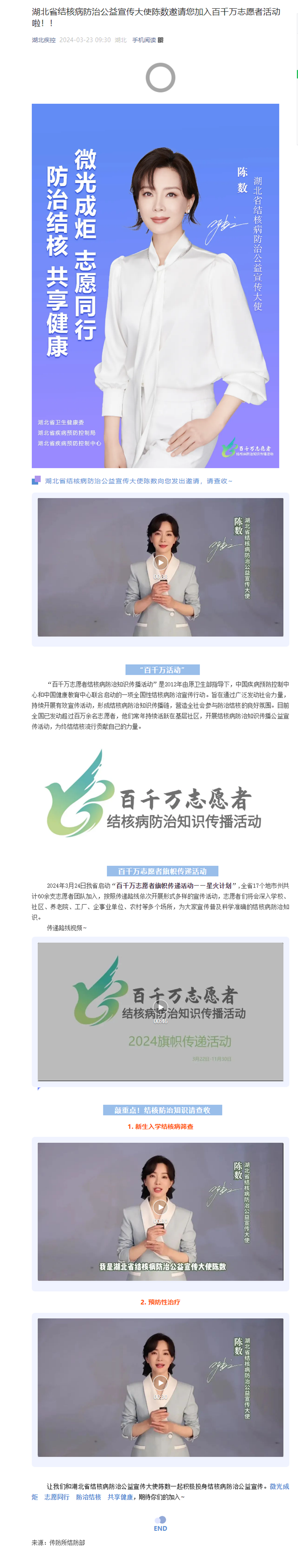 湖北省結核病防治公益宣傳大使陳數邀請您加入百千萬志愿者活動啦!!