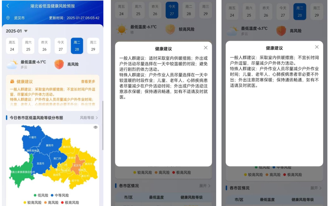 湖北省低溫寒潮健康風險預報為湖北省環境健康風險預報發布平臺三大功能之一,可展示我省當日及未來2日的最低溫度,提示對應的低溫健康風險等級和健康防護建議,其信息展示在空間尺度上可精確至17個地市州的每個區縣。對于不同的天氣情況,低溫健康風險等級共分為“低風險、中等風險、較高風險、高風險、極高風險”5個等級,每個等級所匹配的健康防護建議可以幫助公眾提前做好應對和健康防護,達到降低健康損失的目的。該平臺自2024年12月17日正式上線以來,已連續發布低溫健康風險信息40余天,并將持續發布。