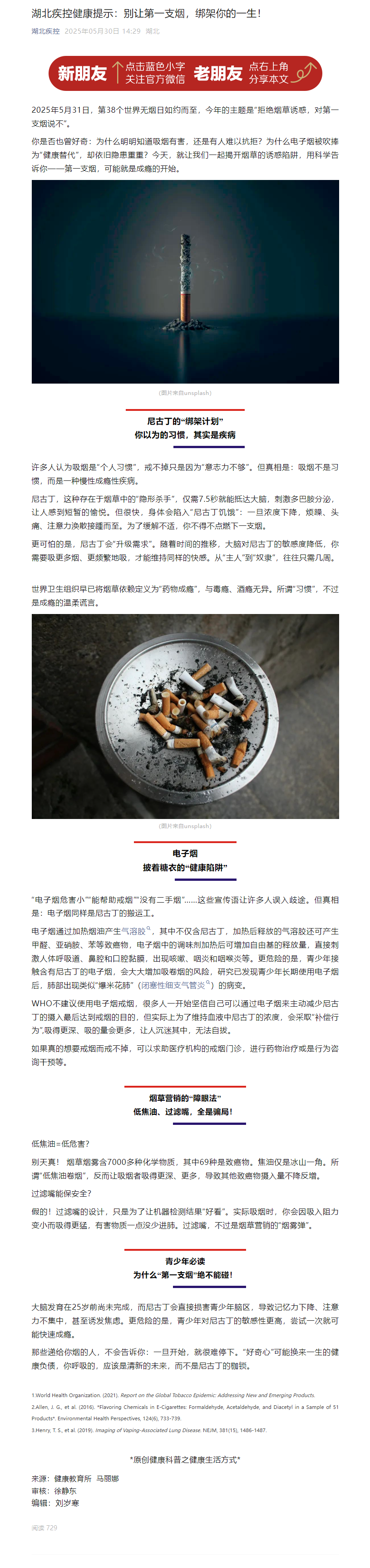 湖北疾控健康提示:別讓第一支煙,綁架你的一生!
