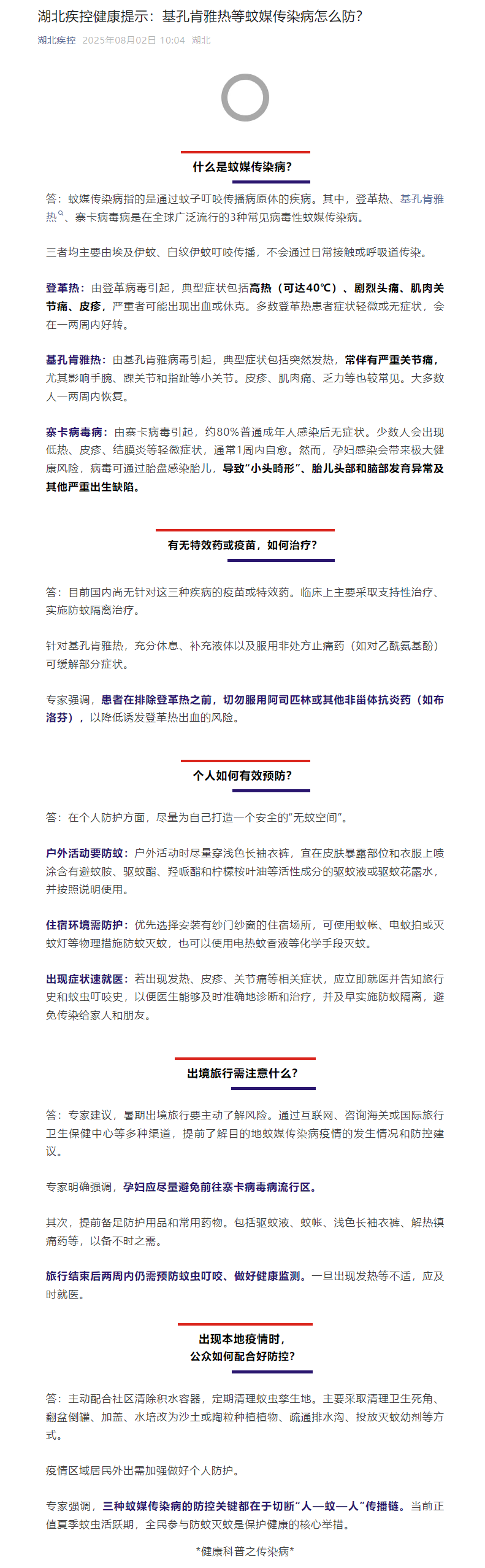 湖北疾控健康提示:基孔肯雅熱等蚊媒傳染病怎么防?