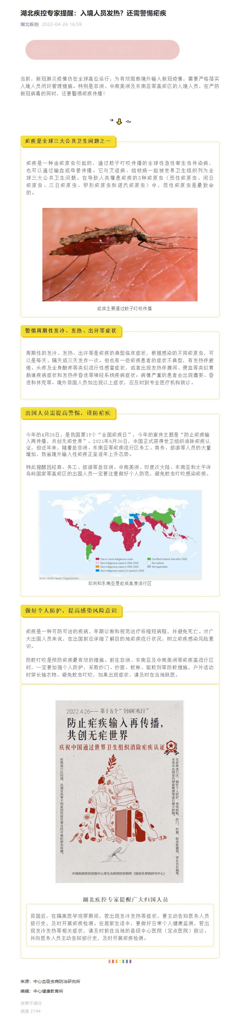 湖北疾控專家提醒:入境人員發熱?還需警惕瘧疾