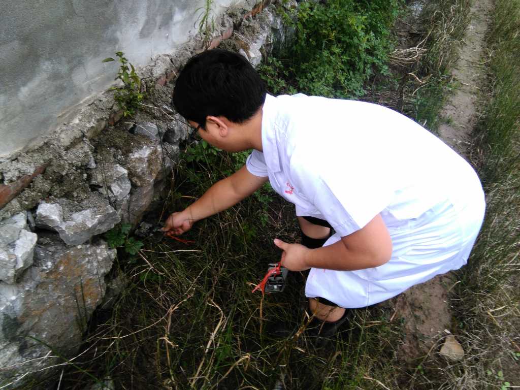 19日,夜幕降臨,在嘉魚潘灣村、渡普蒲圻湖村、新街港東村農戶屋后和田間地頭,出現了穿著白大褂和膠鞋的人,他們踏上泥濘的小路,拔開草叢,彎著腰,目測合適間距,選擇合適地點,放上一個個鐵制器具。他們顧不上蚊蟲叮咬和被毒蛇咬傷的危險,認真地工作著。