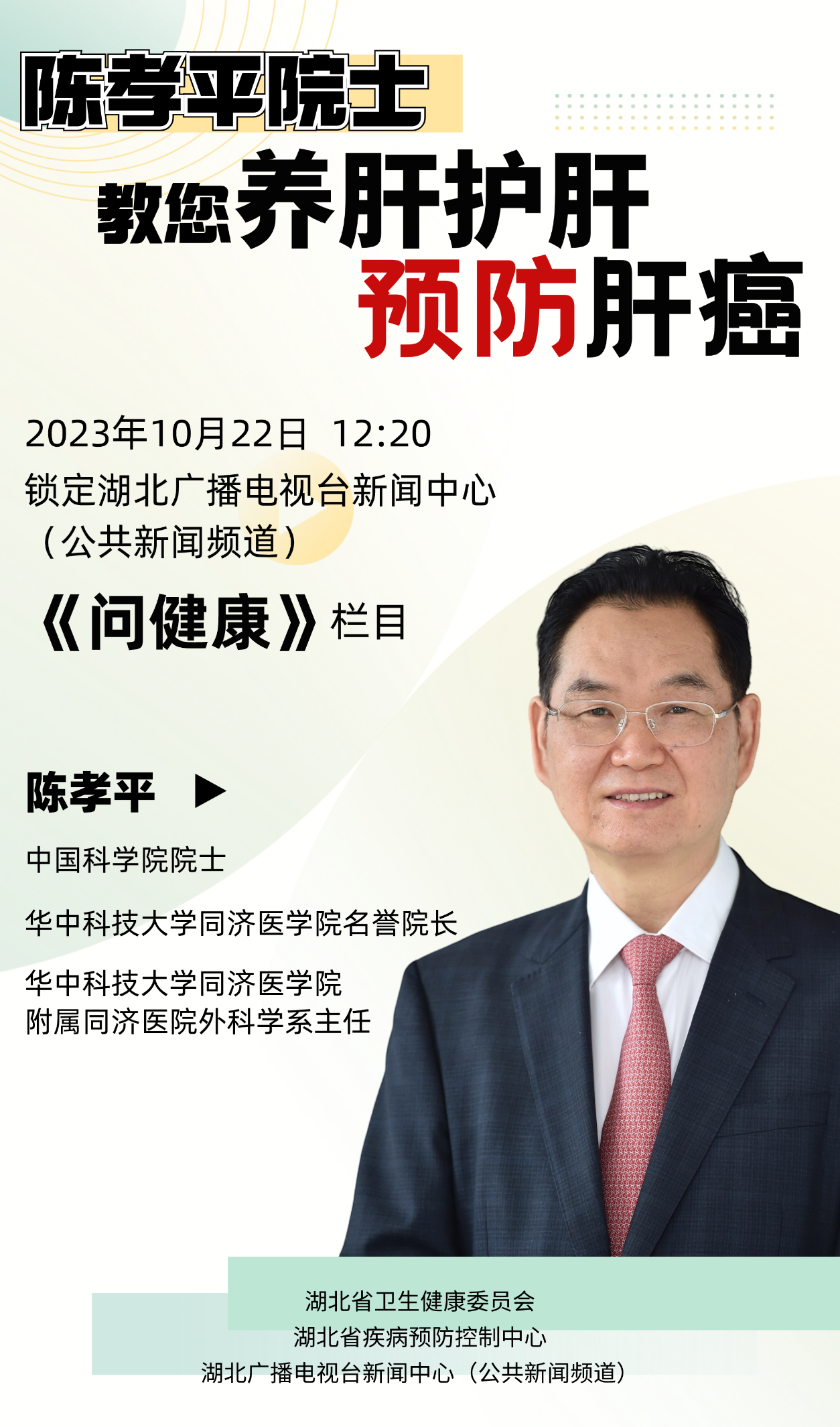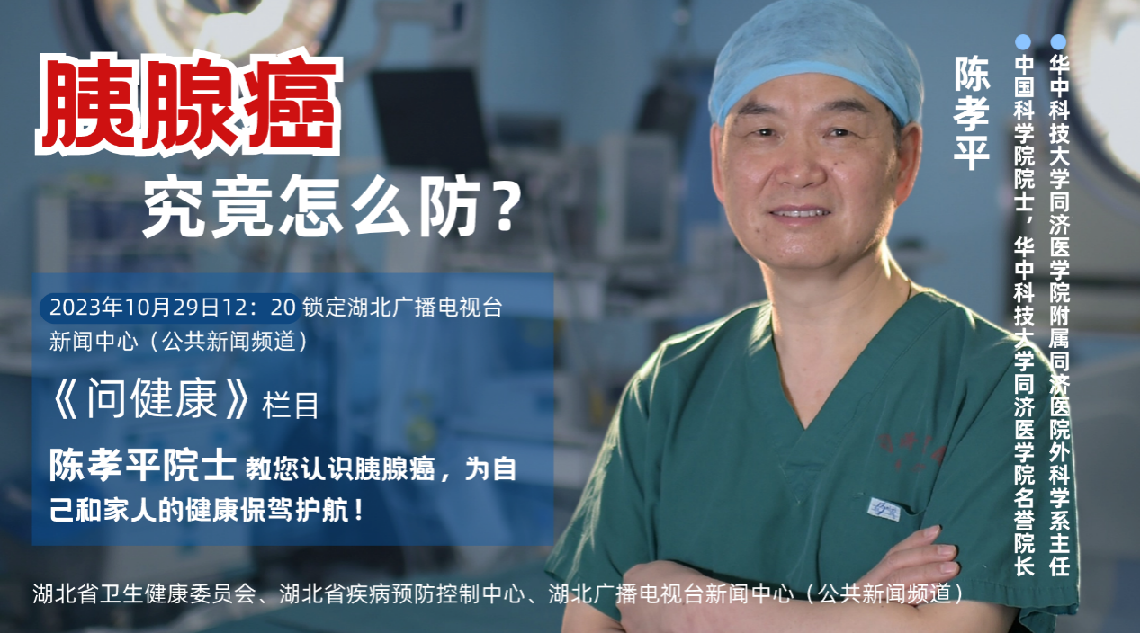 2023年10月8日,在湖北省疾病預(yù)防控制中心黨委書記朱洪波陪同下,中國科學(xué)院院士、華中科技大學(xué)同濟(jì)醫(yī)學(xué)院名譽(yù)院長、華中科技大學(xué)同濟(jì)醫(yī)學(xué)院附屬同濟(jì)醫(yī)院外科學(xué)系主任陳孝平,來到湖北廣播電視臺新聞中心,出鏡電視科普欄目《問健康》,為觀眾解讀肝癌、胰腺癌防治知識。
