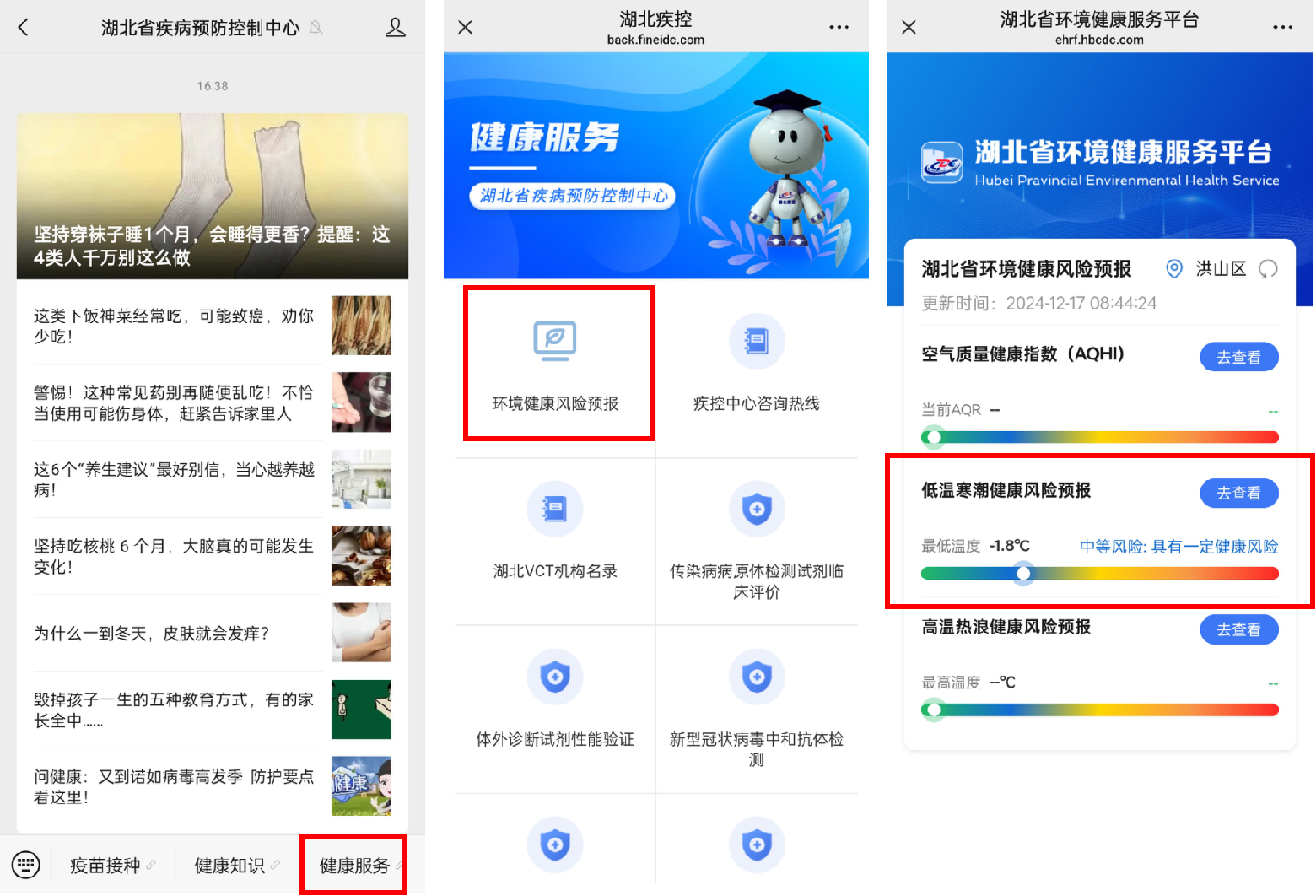 公眾打開湖北省低溫健康風險預防發(fā)布平臺查詢方式如下:關注“湖北省疾病預防控制中心”微信公眾號,點擊右下角的“健康服務”,在新頁面中選擇“環(huán)境健康風險預報”,在三個功能模塊中選擇“低溫寒潮健康風險預報”,具體操作如下圖所示。
