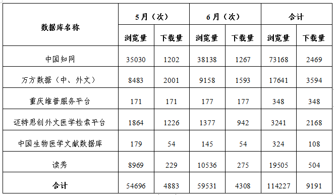5月,數(shù)據(jù)庫(kù)總下載量4883次,比去年同期下降21.65%;6月,數(shù)據(jù)庫(kù)總下載量4308次,同比下降59.70%。